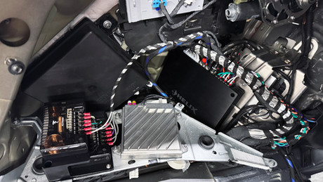 Finally, we have the power and processing. At the core of the system is the Helix V Eighteen DSP, which offers 18 individually controlled and EQ'ed outputs. This allows us to have complete control over the vehicle's audio response, adjusting for in-vehicle acoustical characteristics and customizing the sound to the client's preferences. The Helix DSP also includes an additional 2-channel pre-out connected to our Mosconi AS200.4. The Mosconi amplifier, discreetly placed behind the beauty panels of the subwoofer enclosure and secured to the underside of the rear deck, delivers 950W of power to each subwoofer.
